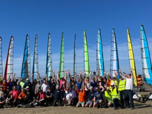 Een aantal Nederlandse leden is eerder vertrokken en zeilen op het strand tijdens de vrije training, terwijl anderen nog onderweg zijn. 5-10 Minuten is het lopen van de camping naar het strand. Het weer is goed. De wind voldoet en de zon schijnt volop. De entourage is fantastisch en de ambiance neemt toe.